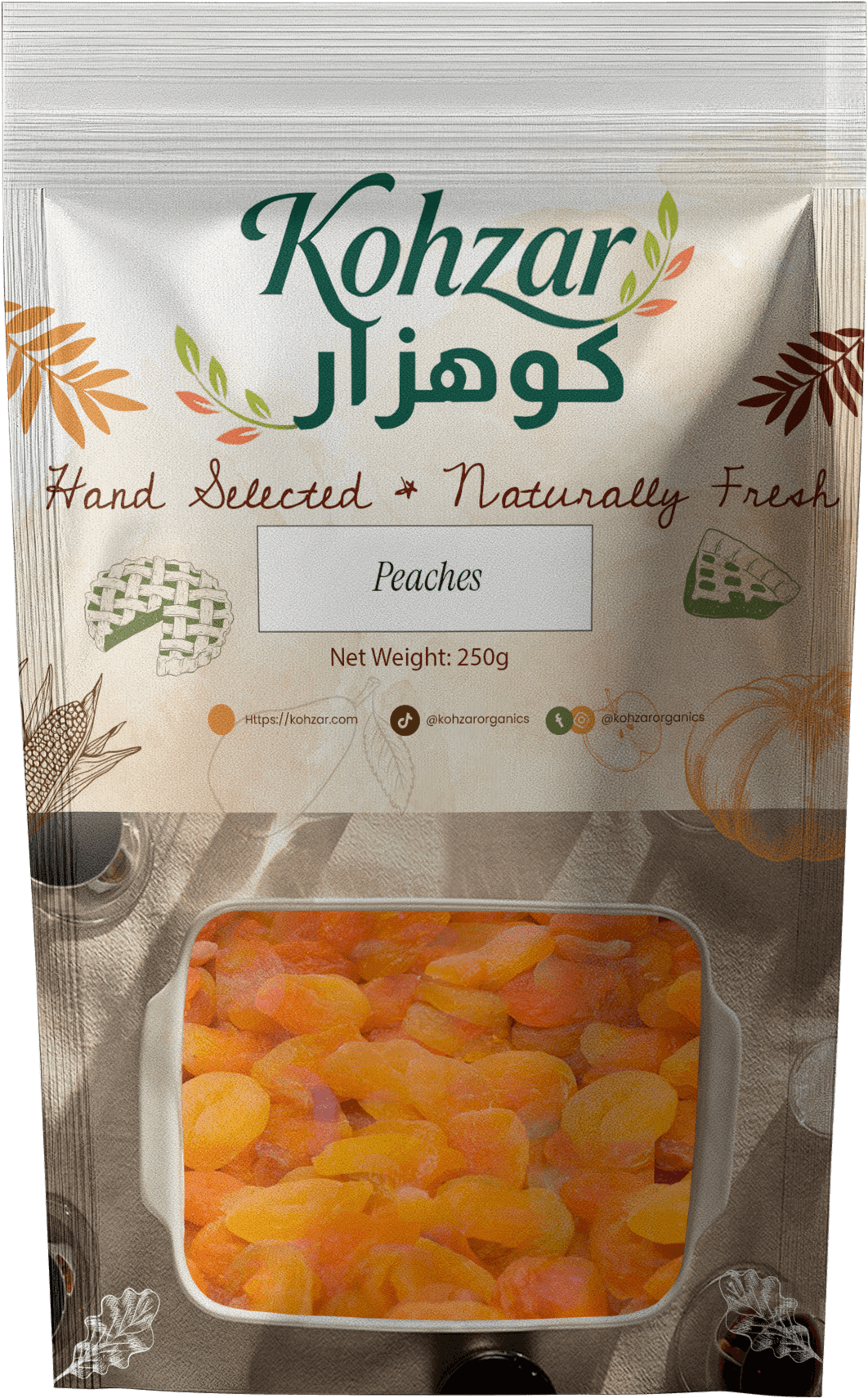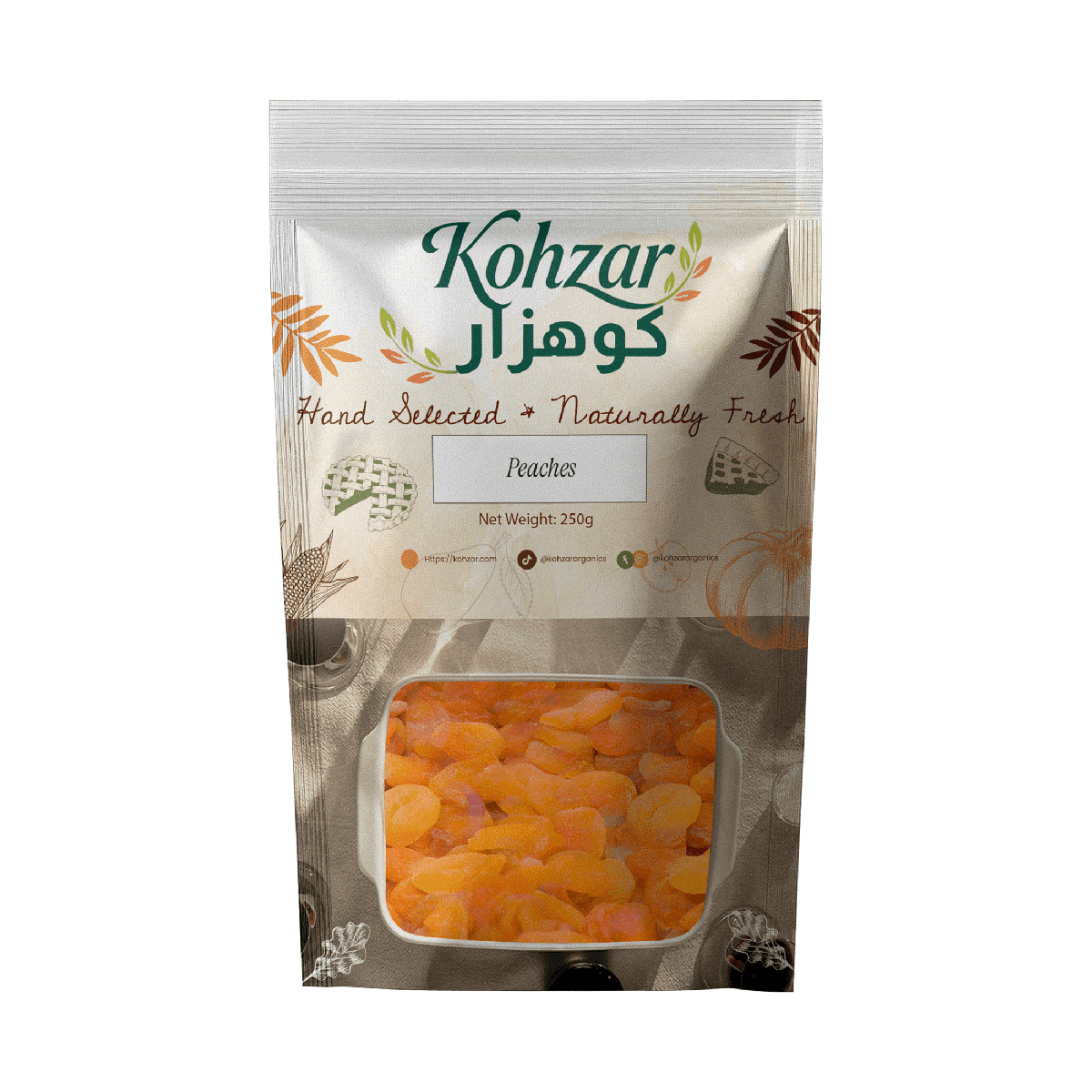 Enjoy the delicious taste of Kohzar Handpicked Dried Peaches, carefully prepared to preserve their natural sweetness and aroma.